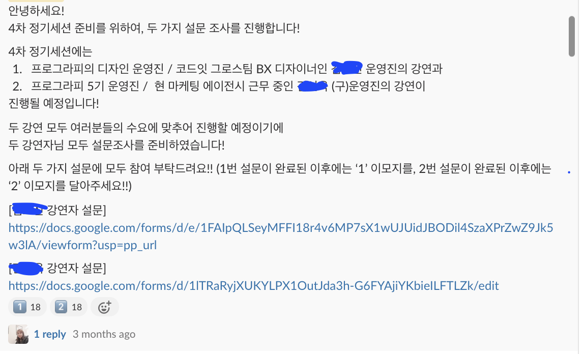 프로그라피에서 세션을 진행해주셨던 분들의 성함을 일일이 동의를 얻고 게시하는 글이 아니기에, 성함 가운데 글자를 *로 처리하였습니다.
